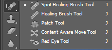 - Spot healing brush tool, berfungsi untuk menghilangkan bagian tertentu dari gambar dengan cara menyesuaikan warnanya dengan sekitarnya. Cara ini cocok digunakan untuk menghilangkan cacat dari gambar seperti jerawat atau goresan.